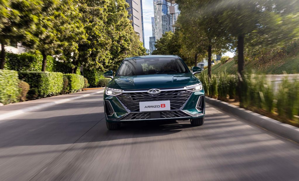 Chirey Arrizo 8 2024 en México – parte frontal en calle, de frente, faros, parrilla, faros LED