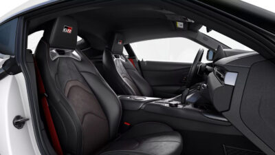 Al entrar, el Supra Final Edition refuerza su enfoque en el conductor. Los cinturones de seguridad en color rojo son el toque más llamativo, complementado por la palanca de velocidades forrada en piel con costuras rojas y los reposacabezas bordados con el emblema GR. La funcionalidad se encuentra con el confort en los asientos deportivos con 12 ajustes eléctricos, un volante forrado en piel y un parabrisas acústico.