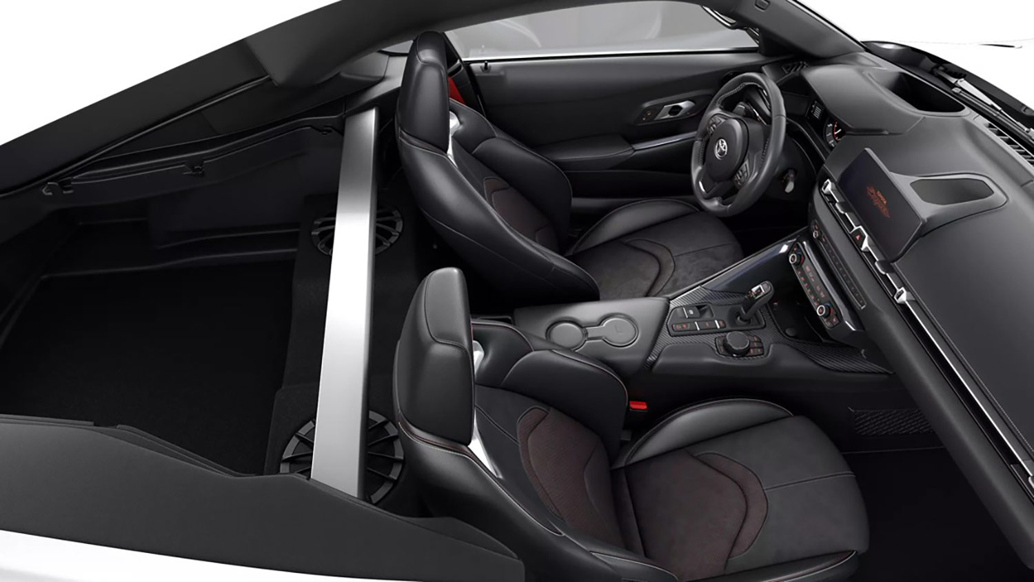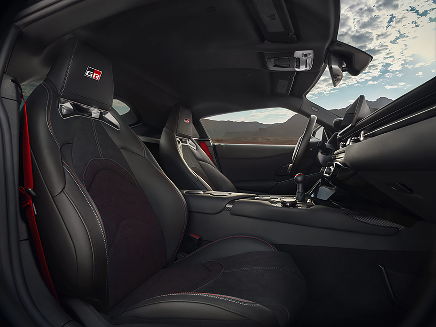 Al entrar, el Supra Final Edition refuerza su enfoque en el conductor. Los cinturones de seguridad en color rojo son el toque más llamativo, complementado por la palanca de velocidades forrada en piel con costuras rojas y los reposacabezas bordados con el emblema GR. La funcionalidad se encuentra con el confort en los asientos deportivos con 12 ajustes eléctricos, un volante forrado en piel y un parabrisas acústico.